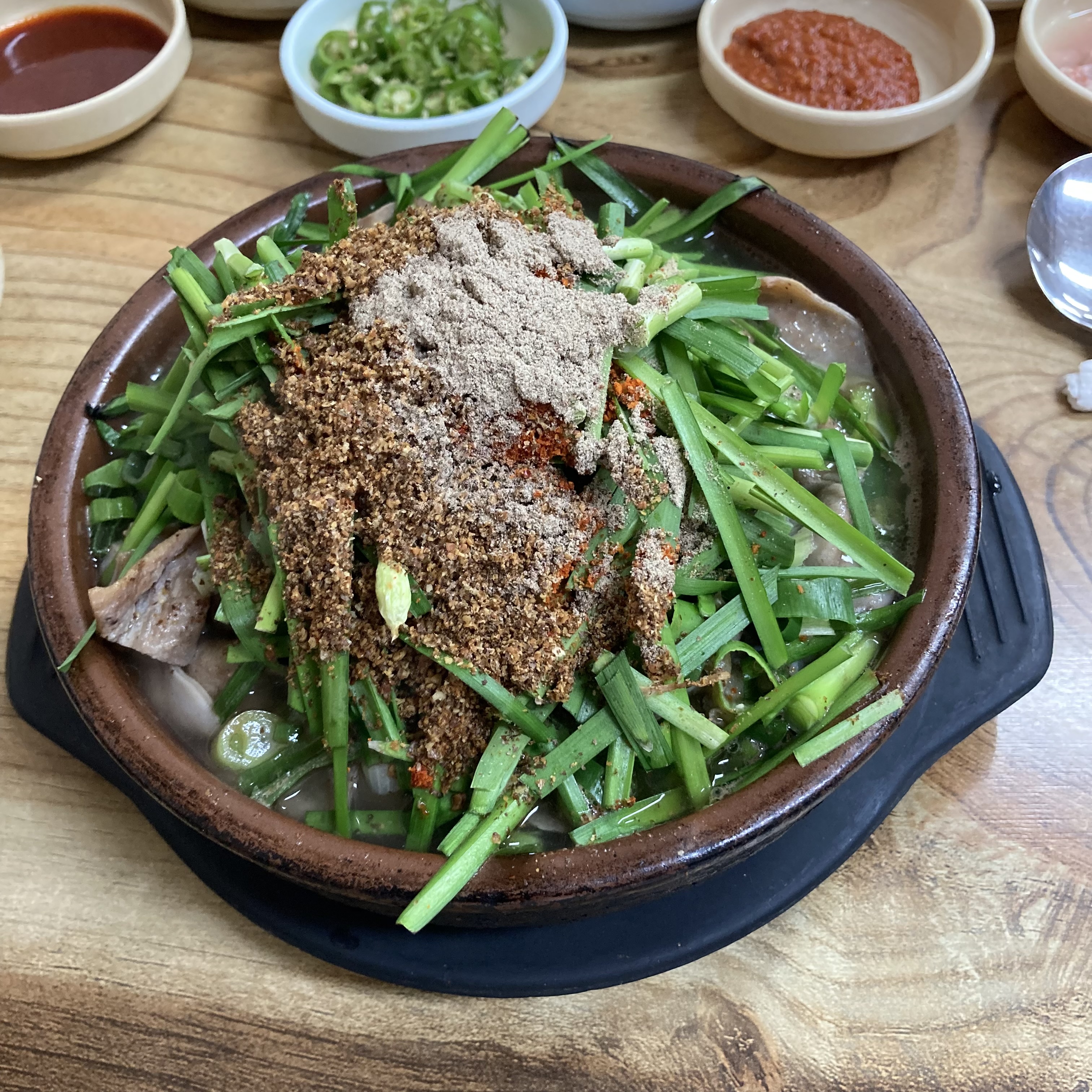 시골순대 국밥의 가장 큰 매력은 바로 깔끔하면서도 깊은 국물입니다. 잡내 없이 개운하면서도 진한 맛이 일품이었고, 듬뿍 들어있는 내장과 향긋한 부추까지 모든 것이 완벽한 조화를 이루었습니다. 제가 살고 있는 곳에서는 차로 20분 거리에 있지만, 이날 방문 후 친구를 꼬셔서 한 번 더 다녀왔을 정도로 인상 깊은 맛집이었습니다. 두번째 갔을 땐 일반으로 먹어봤는데, 다양한 내장종류와 식감을 원하시면 특을 선택하시는걸 추천하고 아닌분들은 일반도 충분하다고 생각합니다.
